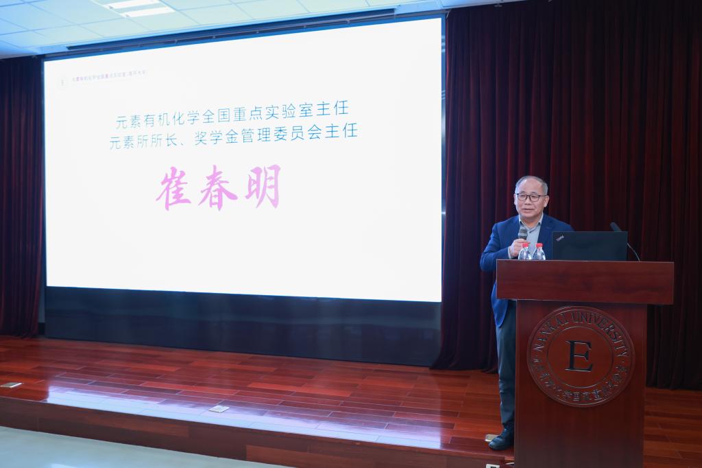 At the beginning of the meeting, Chunming Cui, Director of the State Key Laboratory of Elemento-Organic Chemistry, Director of the Institute of Elemento-Organic Chemistry, and Chair of the Scholarship Management Committee, delivered an opening address. He first extended a warm welcome to the corporate guests and university leaders in attendance, expressed sincere respect for the generous donations from Wanxiang Technology Co., Ltd., Wuhan Zhongke Oxford Spectroscopy Technology Co., Ltd., and TCI (Shanghai) Chemical Industry Development Co., Ltd., and offered warm congratulations to all award-winning students. Chunming Cui stated that the State Key Laboratory of Elemento-Organic Chemistry has always placed talent cultivation at its core, remaining deeply engaged in research and education in the field of organic chemistry, and that university–enterprise cooperation is an important driving force for promoting high-quality development in talent training.