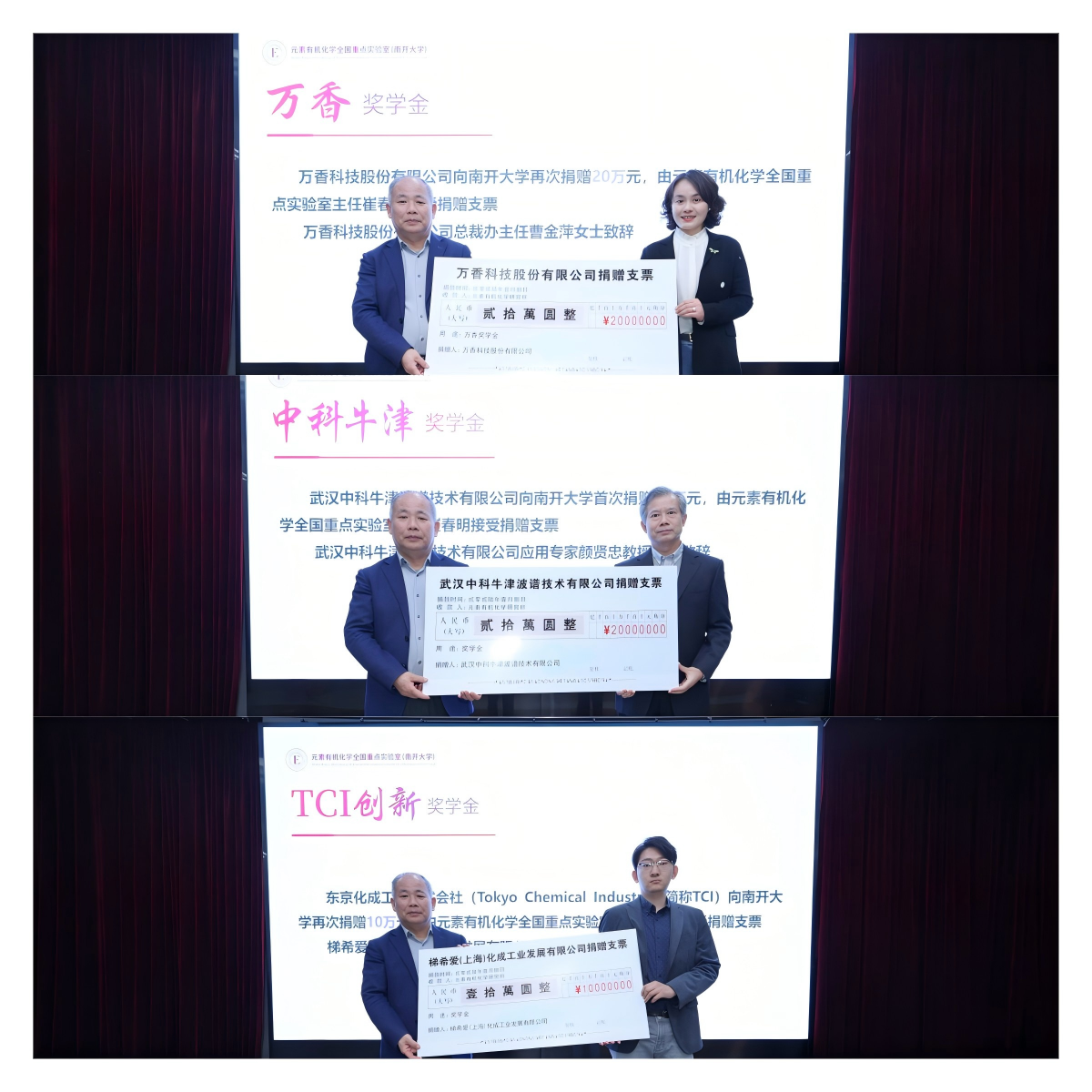 During the donation ceremony, representatives of the donors of the Wanxiang Scholarship, the Zhongke Oxford Scholarship, and the TCI Innovation Scholarship delivered speeches in turn and completed the donation procedures. All parties expressed their continued support for the research and educational work of the Institute of Elemento-Organic Chemistry at Nankai University and their expectations that the award recipients would achieve even greater accomplishments in the future.