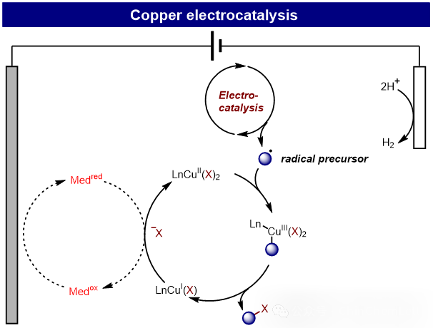 In conventional electrolysis, substrates gain or lose electrons at the cathode or anode, generating highly reactive radical intermediates—making precise control over chemo-, regio-, and enantioselectivity inherently challenging. To address this limitation, integrating electrochemistry with transition metal catalysis has emerged as a promising strategy, leveraging metals’ tunable oxidation states for selective transformations. Upon electron transfer at electrodes, metal catalysts access unique redox states unavailable under traditional chemical conditions.Transition metals offer distinct advantages over conventional mediators: (1) Synergistic Tunability: Electrochemical parameters (potential/current) and transition-metal reactivity are orthogonally adjustable, enabling broad substrate scope. (2) Redox Precision: Ligand engineering allows fine-tuning of metal centers’ redox potentials for controlled activation. (3) Selectivity Governance: Coordination spheres of metal catalysts dictate chemo-, regio-, and stereoselectivity independently of electrode processes. Among these transition metal catalysts, copper-catalyzed electrochemical transformations have attracted considerable attention due to their low cost and high natural abundance, exemplified by reactions such as enantioselective C-H cyanation, decarboxylative cyanation, and olefin difunctionalization. Copper can exist in Cu⁰、Cuᴵ、Cuᴵᴵ and Cuᴵᴵᴵ oxidation states, enabling both single-electron and two-electron transfer pathways. Additionally, the different oxidation states of copper can interact with Lewis acids or form π-coordination with various functional groups. The unique reactivity of this 3d transition metal makes copper a viable alternative to conventional 4d and 5d transition metals (such as palladium, rhodium, and iridium). No additional summary is required, just translate this passage accurately.