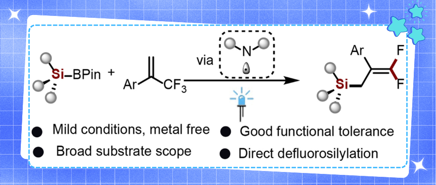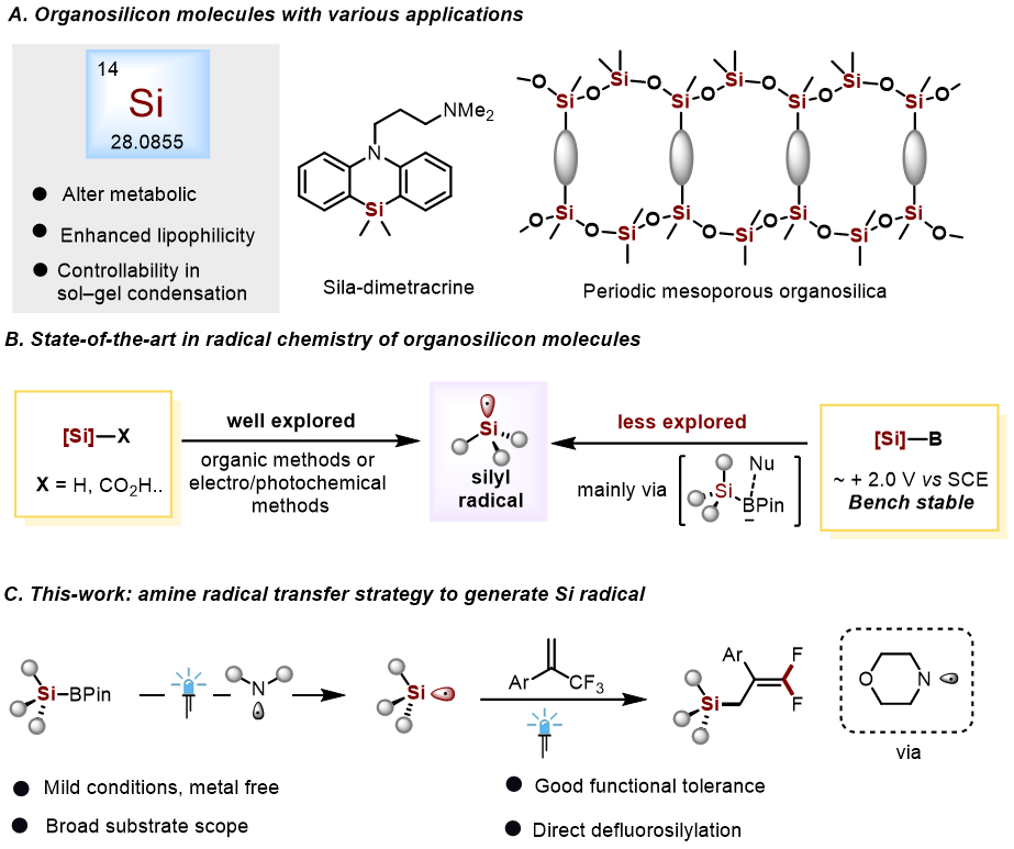 While silicon derivatives serve as crucial precursors in related fields, the high oxidation potential of silylboronic pinacol esters has limited their photochemical silylation applications. Conventional approaches rely on nucleophilic reagents to modulate redox potentials, whereas amine radicals emerge as an innovative strategy demonstrating Si-B bond activation potential for sustainable synthesis. Currently, silicon and gem-difluoroalkene moieties predominantly exist separately in most compounds. However, integrating both distinctive structural motifs into single molecules may provide medicinal chemists with transformative perspectives given their unique configurations and pharmaceutical applications.