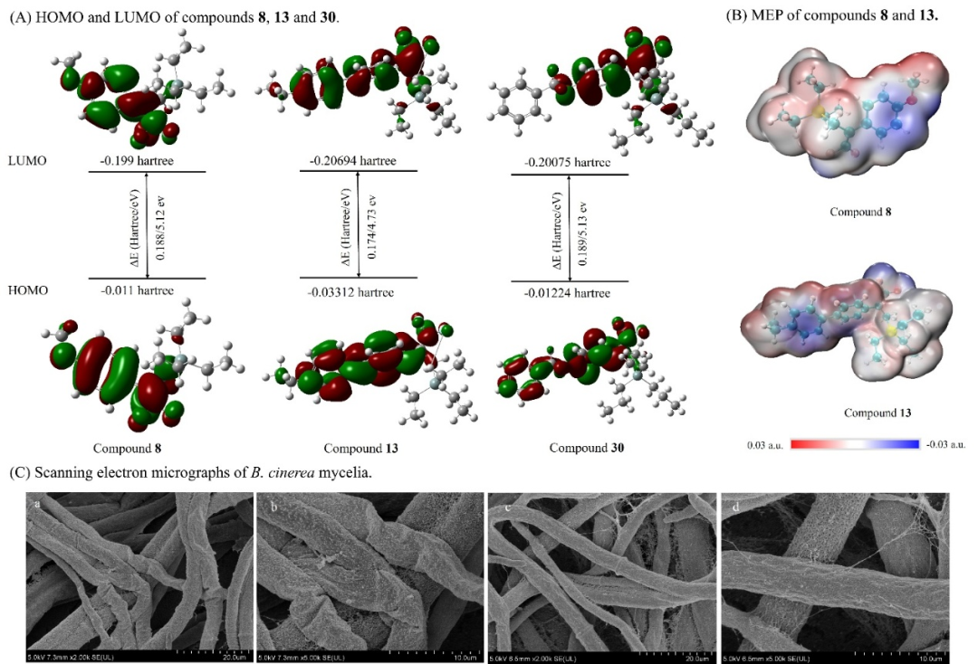 The authors developed an efficient method to generate silyl radicals through homolytic substitution reactions of silylboronic pinacol esters with amine radicals, simultaneously incorporating gem-difluoroalkene fragments. This approach enables the scalable synthesis of silicon-containing difluoroalkene compounds under mild conditions, demonstrating remarkable antifungal activity (>60% inhibition rate at 50 μg/mL against pathogens like Botrytis cinerea), with EC₅₀ values surpassing or matching commercial fungicides. DFT and molecular electrostatic potential (MEP) analyses revealed unique electronic characteristics of high-activity compounds, while scanning electron microscopy confirmed their ability to effectively inhibit fungal mycelial growth. This study provides innovative lead compounds for developing structurally optimized fungicides with novel mechanisms.
