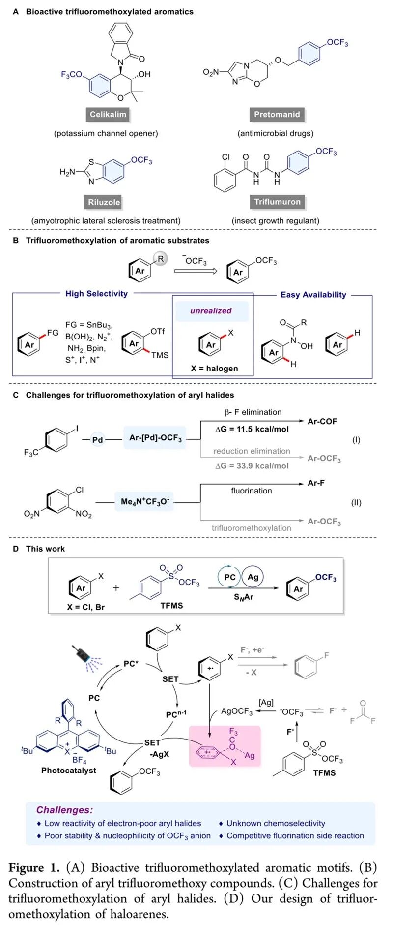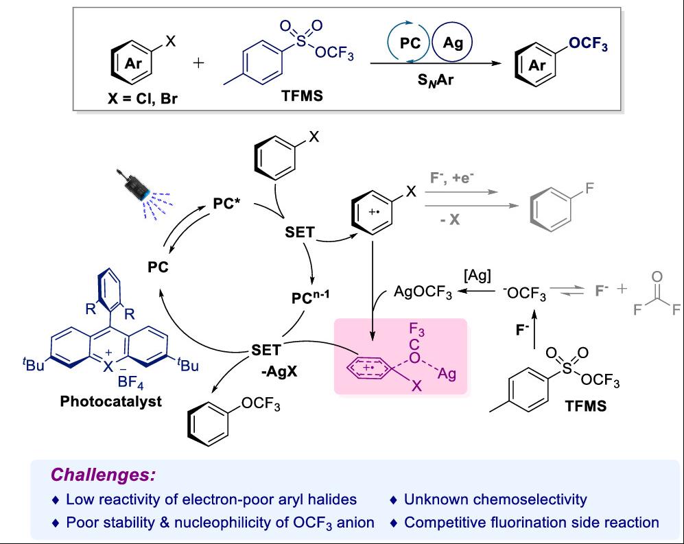 Recently, Pingping Tang’s team, for the first time, has successfully achieved the trifluoromethoxylation of aryl halides via photocatalyzed aryl cationic radical intermediates. By introducing silver salts, challenging inert electron-neutral and electron-deficient aryl halides also participated smoothly in the reaction. As a result, various trifluoromethoxylated aromatics were obtained in up to 95% isolated yields. Further DFT calculations revealed that the presence of silver facilitates the departure of the halogen, with a lower energy barrier, thereby enhancing the reactivity of inert aryl halides. This method also accommodates bioactive aromatic molecules as substrates, indicating further application in medicinal chemistry. Beyond its immediate synthetic utility, the silver-enabled promotion protocol may also inspire other efficient systems for challenging transformations with implications spanning organic synthesis, materials science, and drug discovery. Relevant achievements were published in J. Am. Chem. Soc., 2025, 10.1021/jacs.5c11167.