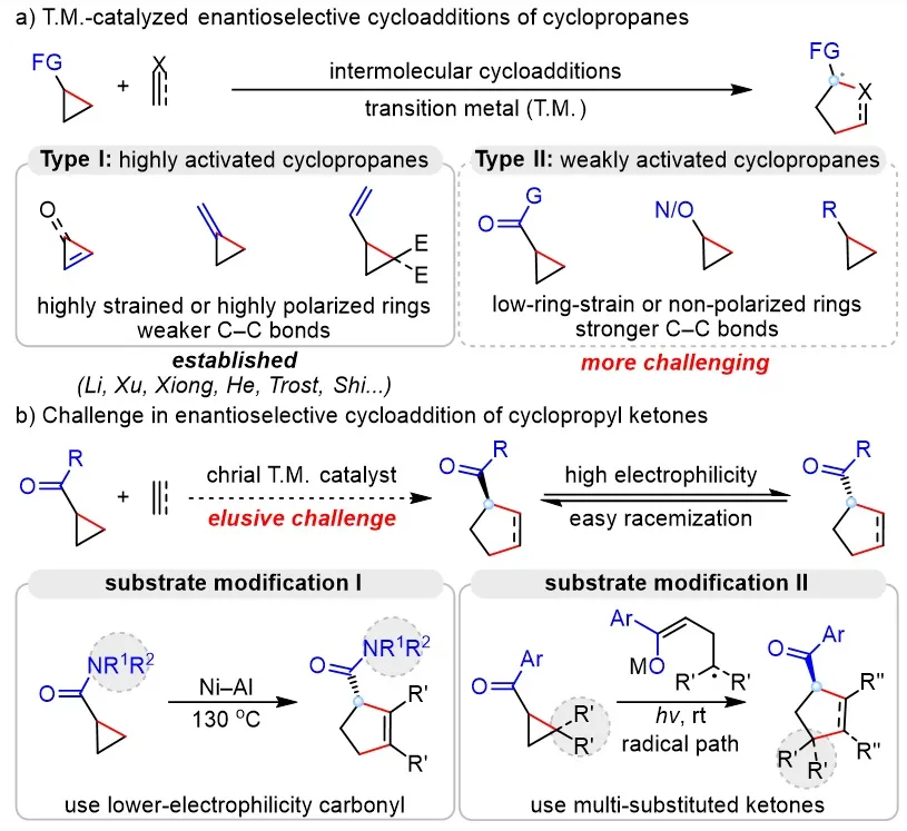 Transition metal–catalyzed enantioselective cycloaddition of cyclopropanes with π-unsaturated compounds represents one of the most important strategies for constructing chiral five-membered ring structures. However, owing to the high C–C bond energy of cyclopropanes, their activation is intrinsically challenging. Consequently, existing methods are largely confined to cyclopropanes bearing high ring strain or strongly electron-withdrawing substituents (Figure 1a, Type I), and are difficult to apply to weakly activated cyclopropyl ketones that are inexpensive, readily available, and synthetically versatile (Figure 1a, Type II). The central challenge in achieving highly enantioselective cycloaddition of cyclopropyl ketones lies in the strong electrophilicity of the ketone carbonyl group. Under the elevated temperatures or Lewis acid conditions typically required for C–C bond cleavage, the chiral α-tertiary carbon center in the product is difficult to maintain and is prone to racemization (Figure 1b). As a result, although racemic cycloaddition reactions of cyclopropyl ketones have been successfully developed since 2006, highly enantioselective variants have remained elusive. To address this issue, several substrate-modification strategies have been developed. For example, replacing the ketone with a less electrophilic carboxamide group enables highly enantioselective cycloaddition with alkynes at 130 °C (Figure 1b, left). Alternatively, the use of multisubstituted cyclopropanes to stabilize radical intermediates has allowed the development of radical-type cycloaddition reactions under mild conditions (Figure 1b, right). Although these approaches can achieve high enantioselectivity, the specific structural requirements of the substrates significantly limit product diversity and thereby restrict the scope of application. Therefore, achieving efficient asymmetric cycloaddition of simple cyclopropyl ketones through catalyst control remains a key and long-standing challenge in this field.