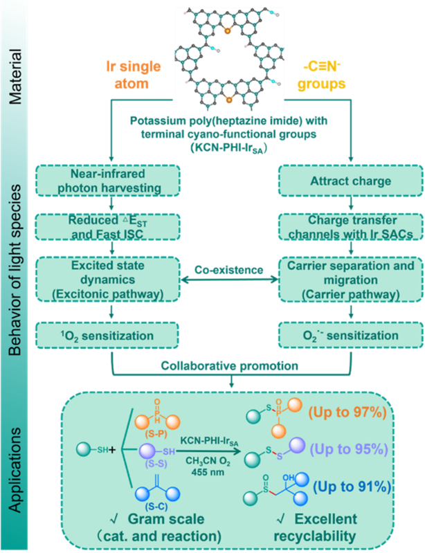 To address this challenge, the Qingmin Wang group at Nankai University reported a poly(heptazine imide) (K-PHI)–based photocatalyst bearing atomically dispersed iridium single-atom sites and electron-deficient terminal cyano (−C≡N−) groups, which enables the coupling of exciton- and carrier-mediated pathways. The iridium single-atom sites reduce the singlet–triplet energy gap (ΔEST) to promote intersystem crossing (ISC) and the formation of triplet excited states (T1), thereby enhancing exciton-mediated energy transfer. In parallel, the terminal cyano groups form charge transport channels that accelerate charge separation and interfacial electron transfer, while the synergy between the single-atom sites and cyano groups extends the light-absorption range. This dual-pathway design boosts reactive oxygen species (ROS) generation under visible light: exciton-mediated energy transfer predominantly yields singlet oxygen (¹O₂), whereas carrier-mediated electron transfer yields superoxide radicals (O₂•−); together, these processes drive visible-light-driven aerobic oxidative coupling for the formation of S−X (X = P, C, S) bonds. The system operates without sacrificial agents or additional cocatalysts, offers a broad substrate scope with gram-scale productivity, and maintains activity over five cycles, and the approach is compatible with gram-scale preparation of the single-atom catalyst, underscoring its practical potential. Relevant achievements were published in ACS Catalysis, 2026, DOI: 10.1021/acscatal.6c00056.